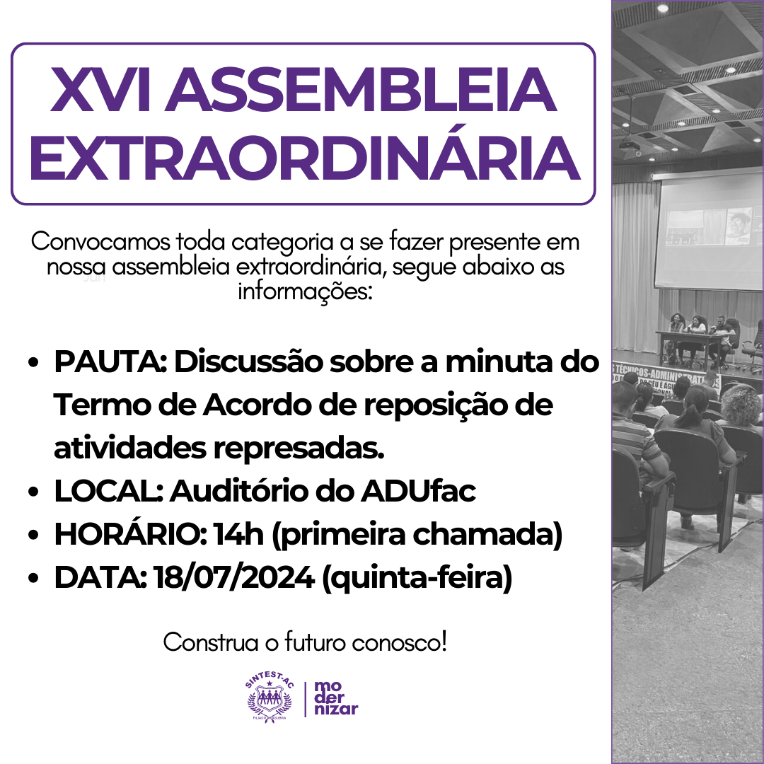 XVI ASSEMBLEIA EXTRAORDINÁRIA Convocamos toda categoria a se fazer presente em nossa assembleia ver mais » 15/07/2024